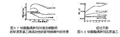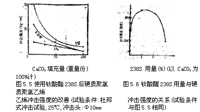 由圖5.4可見,在碳酸鈣的填充量高時,鈦酸酯改善流動性的效果十分明顯,而圖5.4和圖5.6示出了在硬質(zhì)聚氯 乙烯中使用238S時所能獲得的沖擊強度改進,其用量以填料100%計,宜1%-2% ,用量過高效果反而不好。