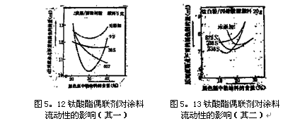 圖5.12和5.13分別示出在鈦白粉-丙烯酸酯體系炭黑-醇酸樹脂體系中使用鈦酸酯偶聯(lián)劑的效果??梢钥闯觯褂免佀狨ヅ悸?lián)劑可以降低展色劑中粘結(jié)料的含量,使之接近于臨界顏料體積的濃度,這是十分符合涂料工業(yè)部門的愿望的,這點在涂料的配方加工中用處很大。