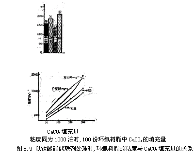 對于以環(huán)氧樹脂為代表的熱固性樹脂采用鈦酸酯也能收到降低配合料的粘度,實現(xiàn)高填充化的效果。如圖5.9所示,采用鈦酸酯偶聯(lián)劑41B,可以使CaCO3 填充量比采用未處理填料時提高30~40%。而且,鈦酸酯對環(huán)氧樹脂的固化不僅沒有延遲作用,反而能降低其固化時可能達到的最高放熱溫度,對提高成型品的尺寸穩(wěn)定性有利。
