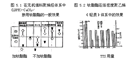 在聚乙烯、聚丙烯等聚烯烴樹脂中填充多量碳酸鈣時,會造成流動性降低,加工困難,這時改用以鈦酸酯預處理的填料就能克服這一缺點。這時的性能變化模式如圖一所示,與無填料的成型品相比,流動性大大降低;伸長率、沖擊強度明顯改善;彎曲強度、抗張強度等幾乎無變化。