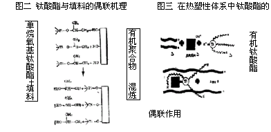 因?yàn)橐廊痪哂锈佀狨サ幕瘜W(xué)結(jié)構(gòu),所以在過(guò)剩的偶聯(lián)劑存在下,使表面能變化,粘度大幅度降低。在基體樹(shù)脂相由于偶聯(lián)劑的三官能基和酯基轉(zhuǎn)移反應(yīng),可使鈦酸酯分子偶聯(lián)。這就便于鈦酸酯分子的變型和填充聚合物體系的選用。見(jiàn)圖二、三、四、五。
